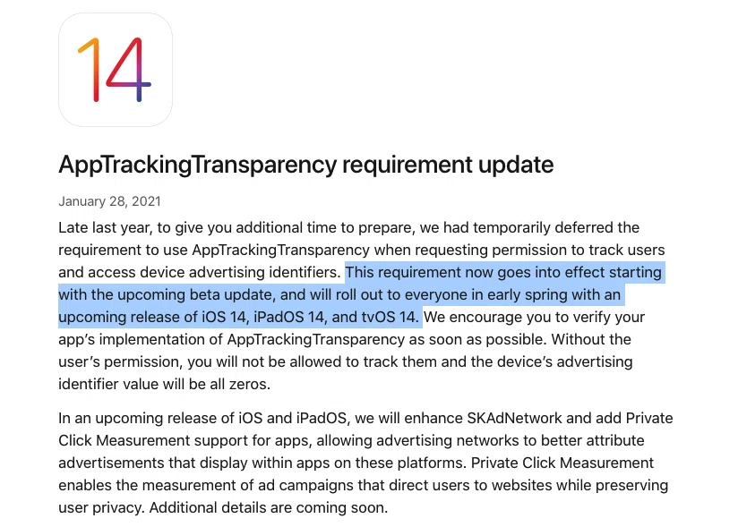先週の金曜日(2021/1/29)、iOS14の新たなPrivacy Policyが、次のバージョンである14.5(今年の春)からスタートすると公式にアナウンスされました。