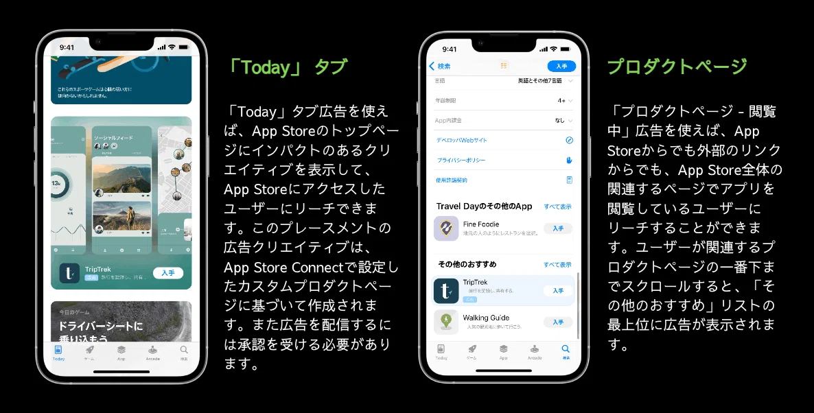 App Storeのトップページに目立つように表示され、App Storeにアクセスしたユーザーが最初に目にするコンテンツになる「Today」タブ広告、またその配信の最初のステップであり、訴求に特化した広告バリエーションが可能になるカスタムプロダクトページを通じて、自社アプリの更なる魅力を発信されてみてはいかがでしょうか?