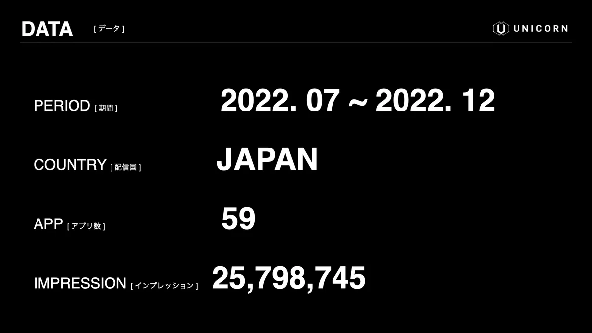 今回の調査は、2022年7月から2022年12月までの6ヶ月間、UNICORNのApple Search Ads最適化エンジンにより国内向けに配信した、59個のアプリを調査対象にしています。