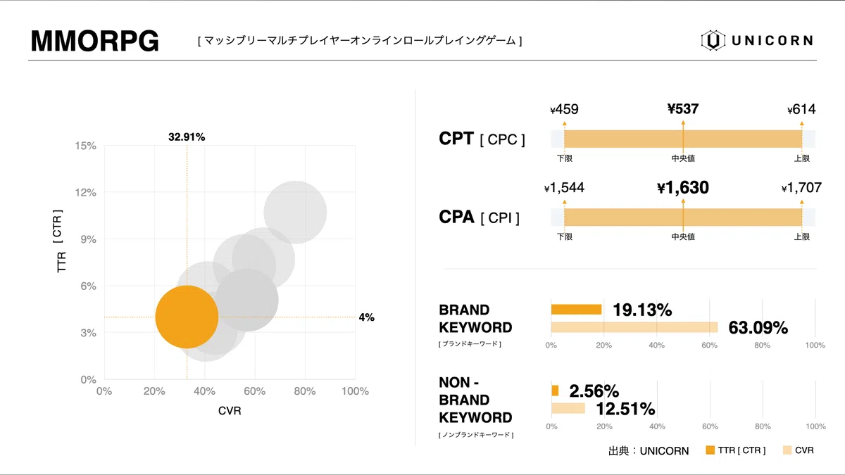 MMORPGにおけるベンチマークは、TTR(CTR)が 4.00%、CVRは32.91%となっており、通常のRPGゲームに比べるとCVRがやや低めの結果でした。
