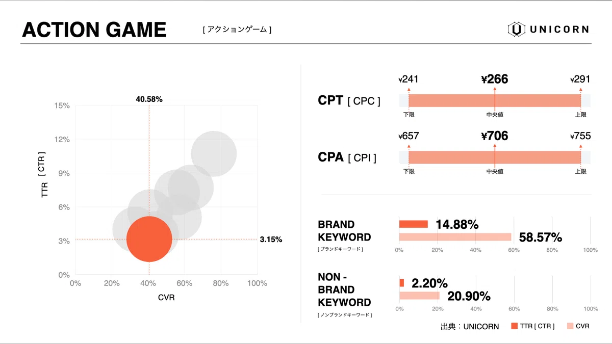 アクションゲームのベンチマークは、TTR(CTR)が3.16%と全ジャンルの中央値よりも低めであり、CVRもやや低め40.58%を記録しました。