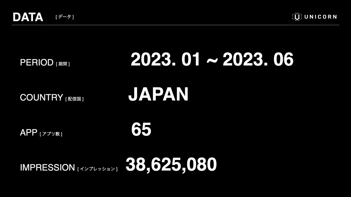 今回の調査は、2023年1月から2023年6月までの6ヶ月間、UNICORNのApple Search Ads最適化エンジンにより国内向けに配信した、65個のアプリを調査対象にしています。