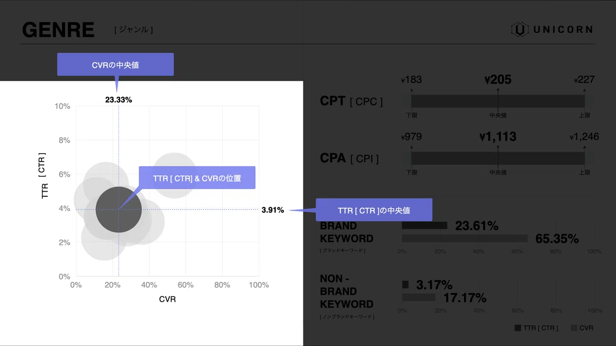 横軸(x)はCVR、縦軸(y)はTTR(タップスルーレート = CTR)の中央値で、これらが交差する位置に、該当ジャンルを円で表示しています。