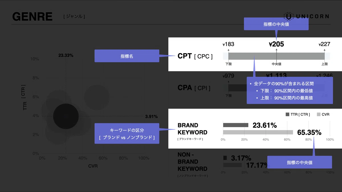 右上は費用に関連する指標であり、CPT(Cost Per Tap = CPC)とCPA(CPI)を表します。そして、グレー色のボックスは該当ジャンルの90%のデータが含まれる区間を意味します。つまり、10%の極端なデータを除き、殆どのデータ指標はこの範囲であることを意味します。その区間の中心が中央値、左の下限が90%区間内の最低値、右の上限が90%区間内の最高値です。