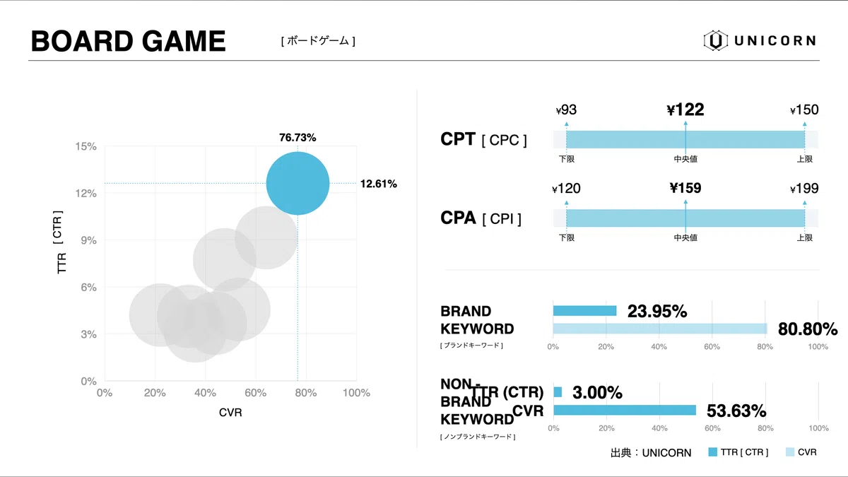 ボードゲームのベンチマークは、TTR(CTR)が12.61%、CVRが76.73%と、両指標ともに前回の調査の際の結果に引き続き、最も高い数値を記録したジャンルでした。