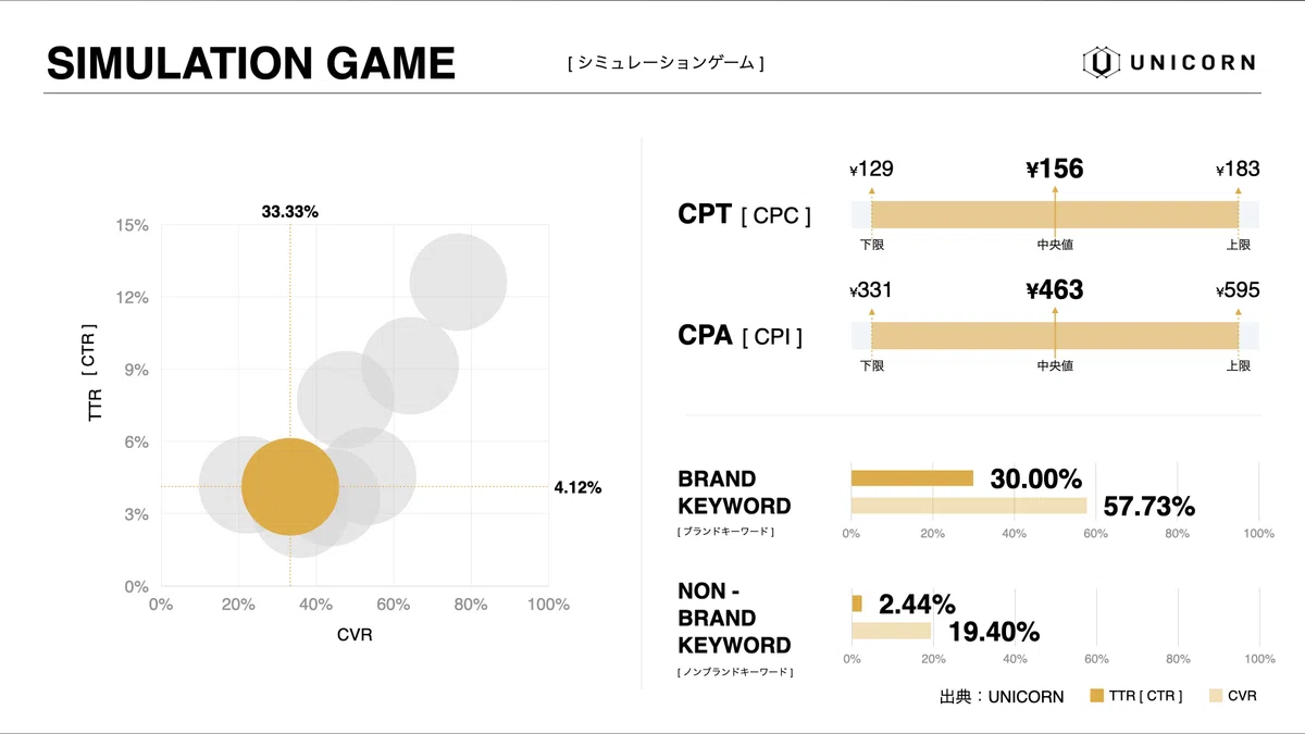シミュレーションゲームは、TTR(CTR)が4.12%、CVRが33.33%となっています。前回の結果と比較して、TTRは約1.5%下落しており、CVRも10%弱下落した結果となっています。そのため、いずれも全ジャンルの中央値よりも低い数値となりました。