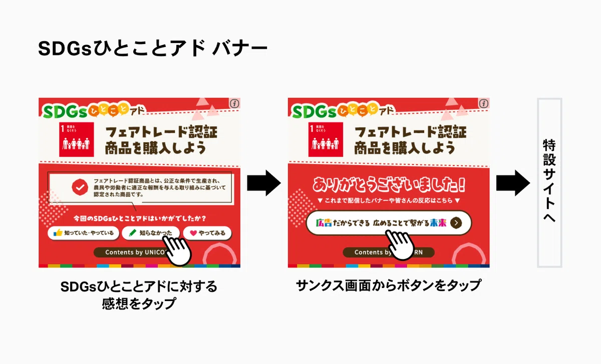 そこで、私たちは、UNICORNの強みであるインタラクティブアドの仕組みを用いて、「SDGsひとことアド」を配信することにしました。