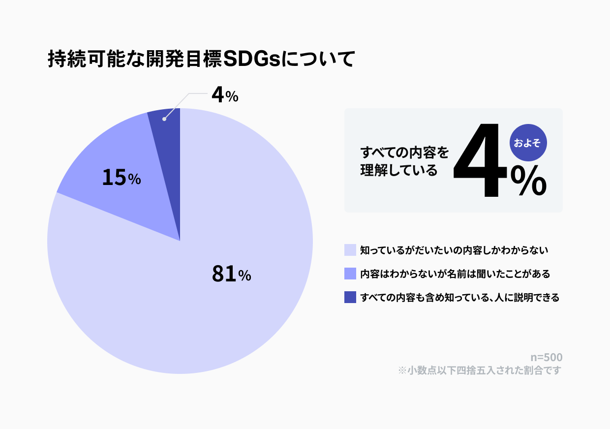 しかし、ケイティケイ株式会社が男女500人に実施したインターネット調査によると、SDGsの全ての内容を理解しているのはおよそ4%にすぎず、多くのユーザーがSDGsについて機会があれば学びたいと答えています。