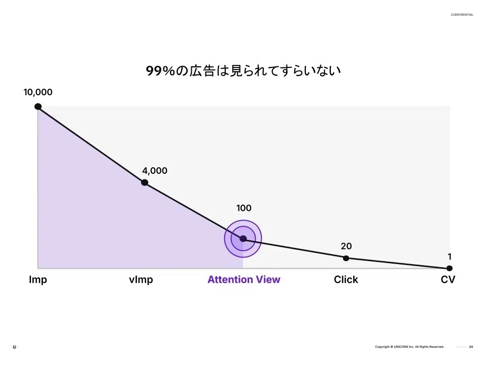 UNICORNでは、記事内のインライン広告として掲載されるレクタングル広告を対象に、「画面中央にある一定時間広告が表示され続けた」という効果測定データを、ユーザーが広告をしっかり見たと定義し、独自に調査した結果、インプレッションに対して、実際に広告を見たAttention Viewの割合は約1%ほどという結果になりました。つまり、広告主がお金を払って配信した10,000インプレッションのうち、9,900インプレッションは、ユーザーに見られていないということです。私たちが思っている以上に、広告は見られていないのです。