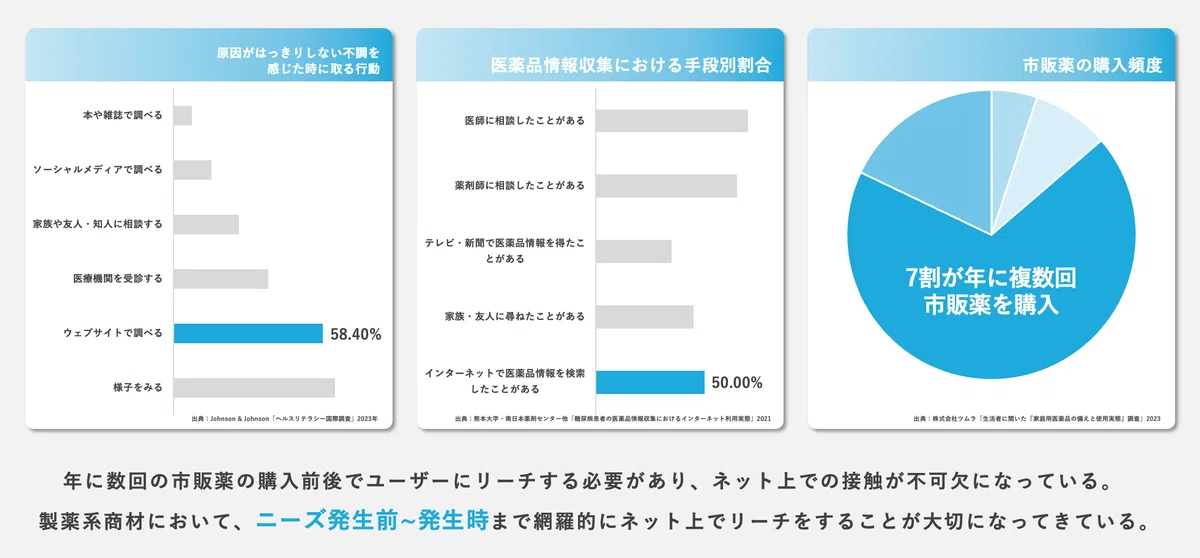 ユーザーが市販薬を購入するタイミングは「年に数回」。しかもその多くが、症状を感じてからインターネットで検索し、ECや店頭で購買へと移行する——そんな購買行動が一般化しています。実際に、「ヘルスリテラシー国際調査」(Johnson & Johnson, 2023年) によると、原因がはっきりしない不調を感じた時に、多くのユーザーがまずインターネットで検索していることがわかります。