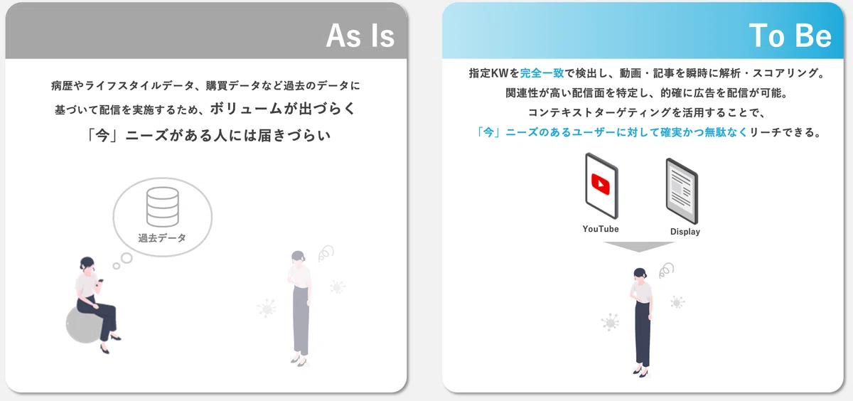 人をベースにしたアフィニティターゲティングと違って、過去のデータに基づいた配信ではなく、「今」まさに症状や薬を調べている瞬間を捉え、ユーザーにリーチすることが可能です。