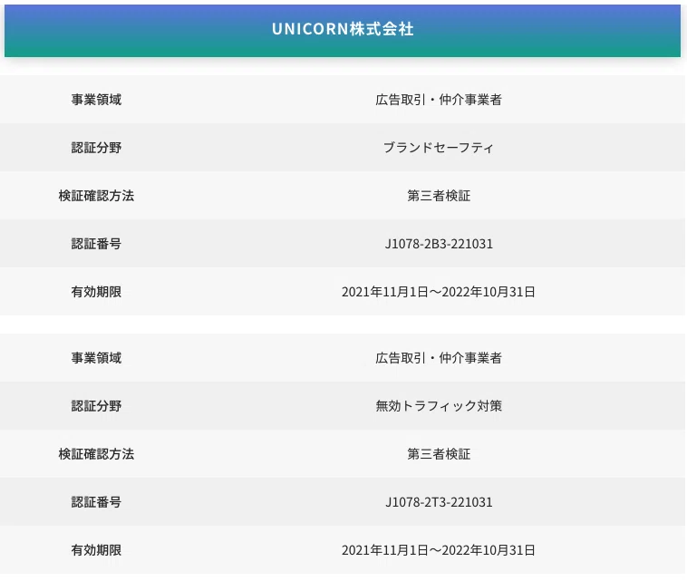 デジタル広告の品質課題のうち、まずは「アドフラウドを含む無効トラフィックの除外」と「広告掲載先品質に伴うブランドセーフティの確保」の品質認証に取り組んでおり、UNICORNはこちらの両部門に認証されました。