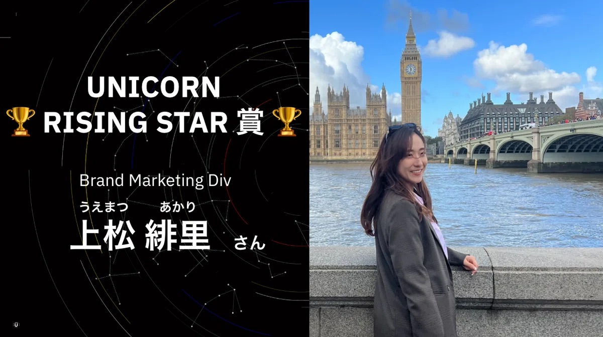 今回フォーカスをするのは、協業先に常駐しながらブランド領域で着実に成果を積み重ね、UNICORNの上半期全社会議で目標達成や組織貢献を表彰するRISING STAR賞を獲得した上松緋里さんです。